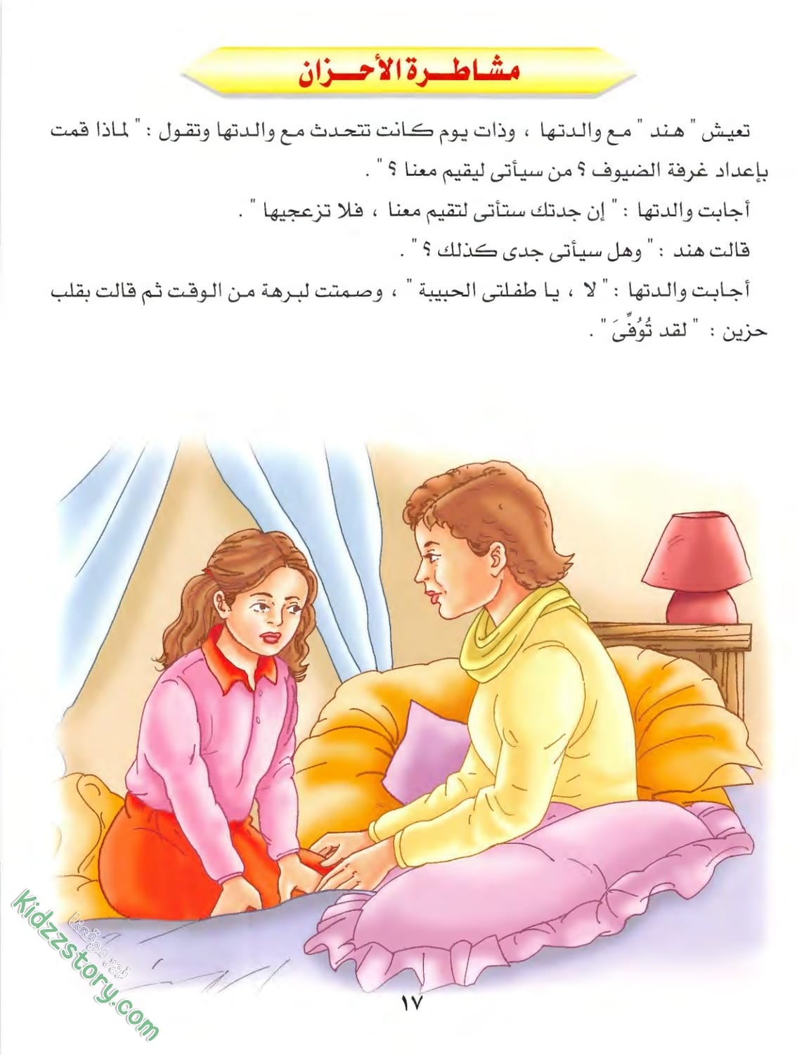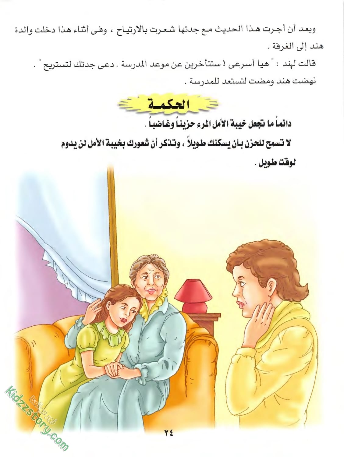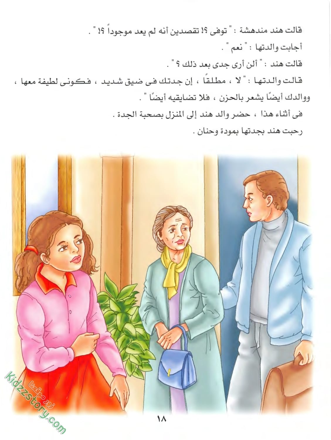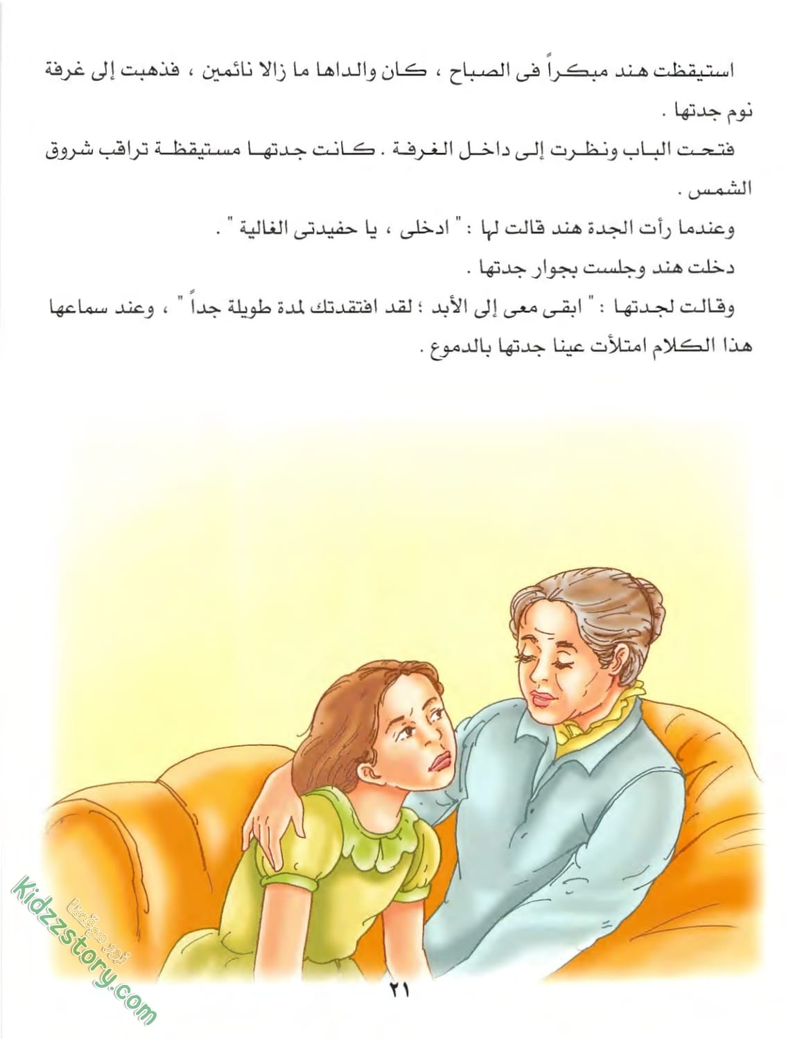 وبعد أن أجرت هذا الحديث مع جدتها شعرت بالارتياح، وفي أثناء هذا دخلت والدة هند إلى الغرفة. قالت لهند: “هيا أسرعي! ستتأخرين عن موعد المدرسة. دعى جدتك لتستريح”. نهضت هند ومضت لتستعد للمدرسة.