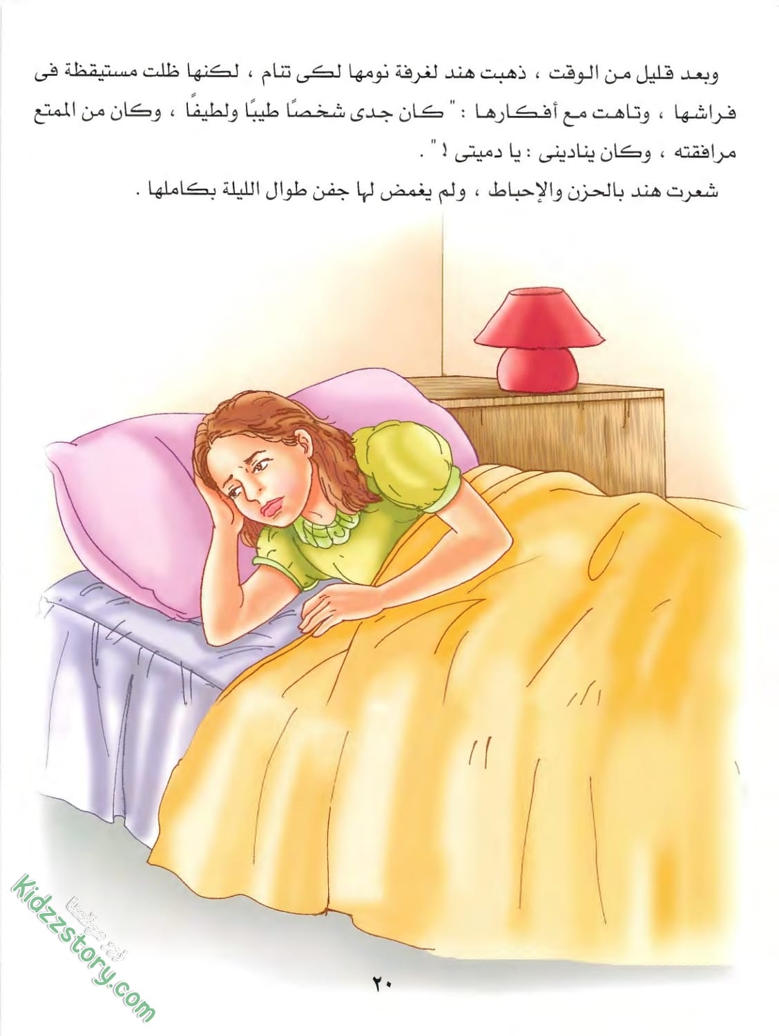 وبعد قليل من الوقت، ذهبت هند لغرفة نومها لكى تنام، لكنها ظلت مستيقظة في فراشها، وتاهت مع أفكارها: “كان جدى شخصاً طيباً ولطيفاً، وكان من الممتع مرافقته، وكان يناديني: يا دميتي!”.