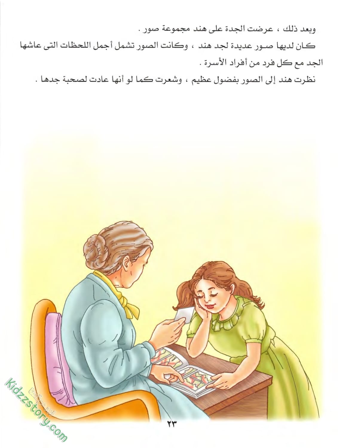بعد ذلك، عرضت الجدة على هند مجموعة صور كان لديها صور عديدة لجد هند، وكانت الصور تشمل أجمل اللحظات التي عاشها الجد مع كل فرد من أفراد الأسرة. نظرت هند إلى الصور بفضول عظيم، وشعرت كما لو أنها عادت لصحبة جدها.