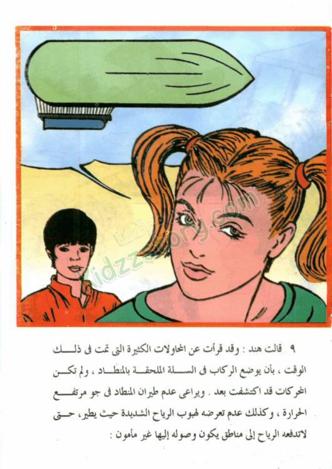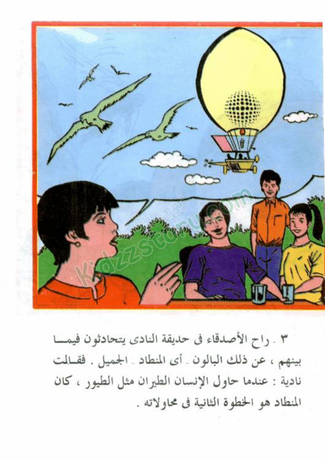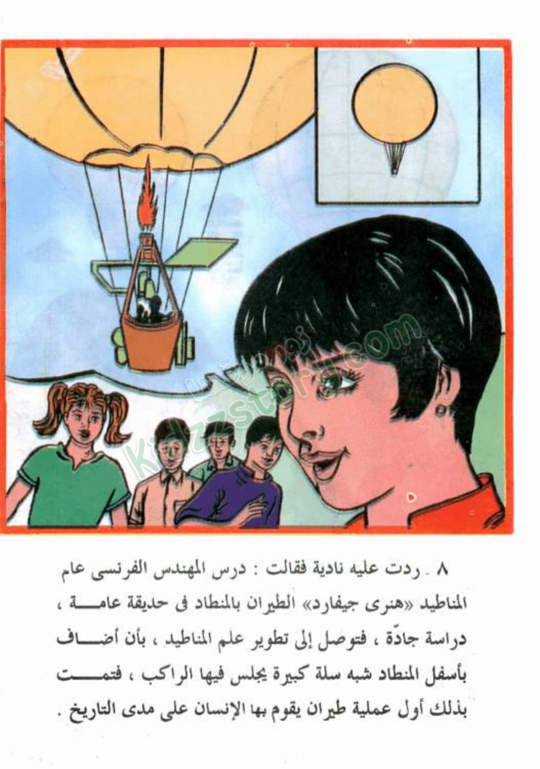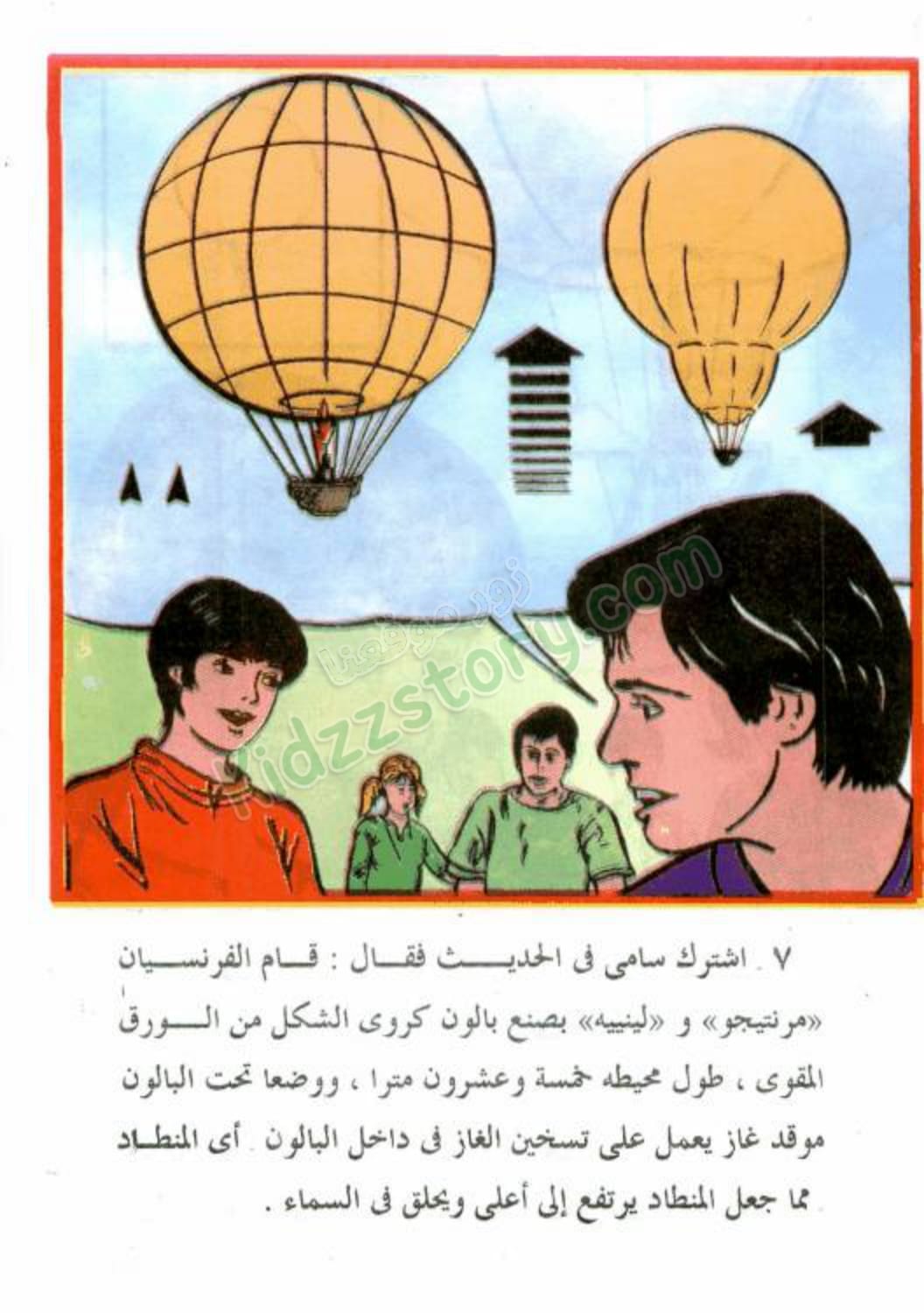 اشترك سامي قائلاً: “قام الفرنسيان مونغولفييه ولينيي بصنع بالون كروي الشكل من الورق المقوى، طول محيطه خمسة وعشرون مترا. وضعا تحت البالون موقد غاز يسخن الهواء داخله، مما جعل المنطاد يرتفع إلى أعلى ويحلّق في السماء.” ردت نادية: “درس المهندس الفرنسي هنري جيفارد الطيران بالمنطاد دراسة جدية وأضاف أسفل المنطاد سلة كبيرة للراكب، ممهدا لأول عملية طيران يقوم بها الإنسان.”