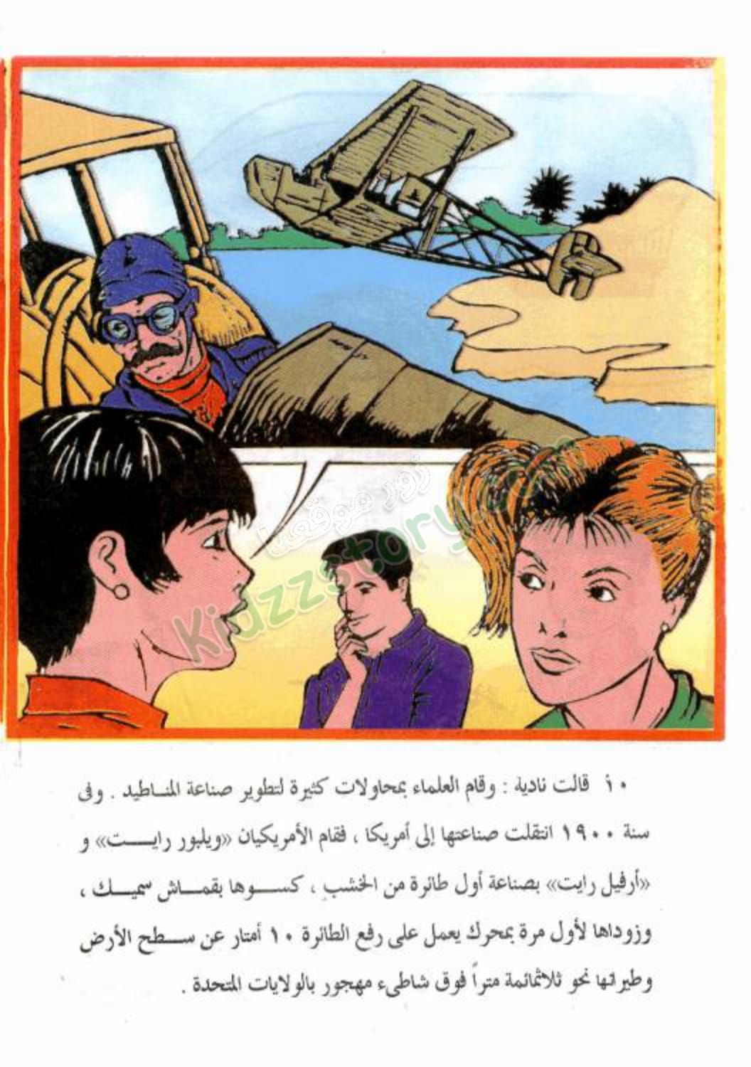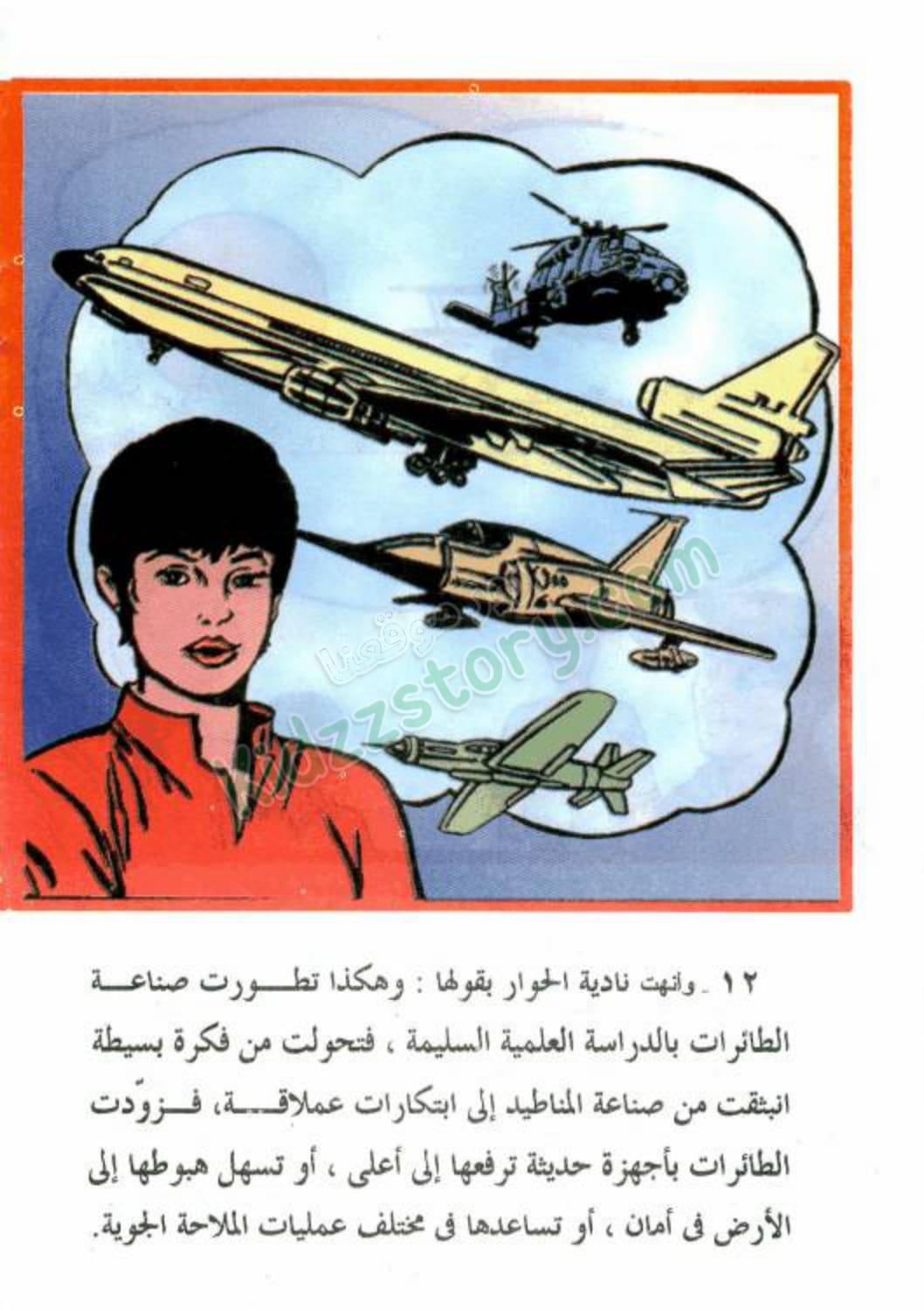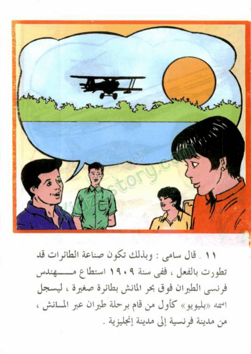 قال سامي: “تطورت صناعة الطائرات بسرعة. في سنة 1909، استطاع المهندس الفرنسي بليوت الطيران فوق بحر المانش بطائرة صغيرة، ليسجل اسمه كأول من قام برحلة طيران عبر المانش.” وأضافت نادية: “هكذا تطورت صناعة الطائرات بدراسة علمية سليمة، محولة فكرة المناطيد البسيطة إلى ابتكارات عملاقة. متميزًا بإضافة أجهزة حديثة ترفعها إلى أعلى ، أو تسهل هبوطها إلى الأرض فى أمان ، أو تساعدها في مختلف عمليات الملاحة الجوية.”