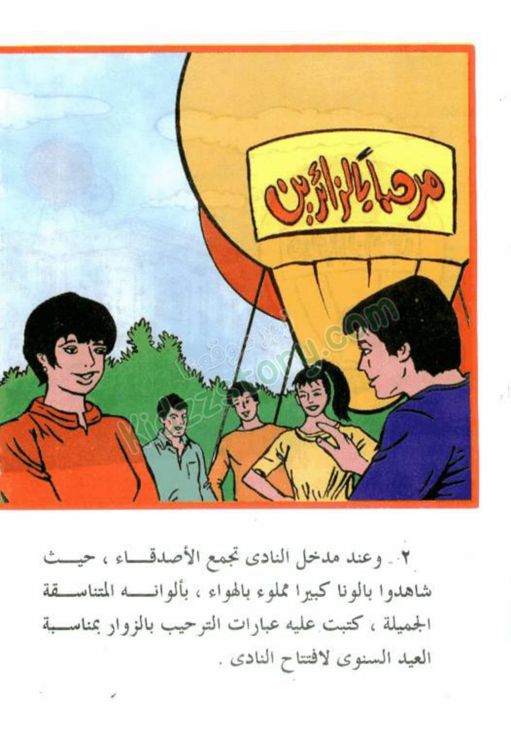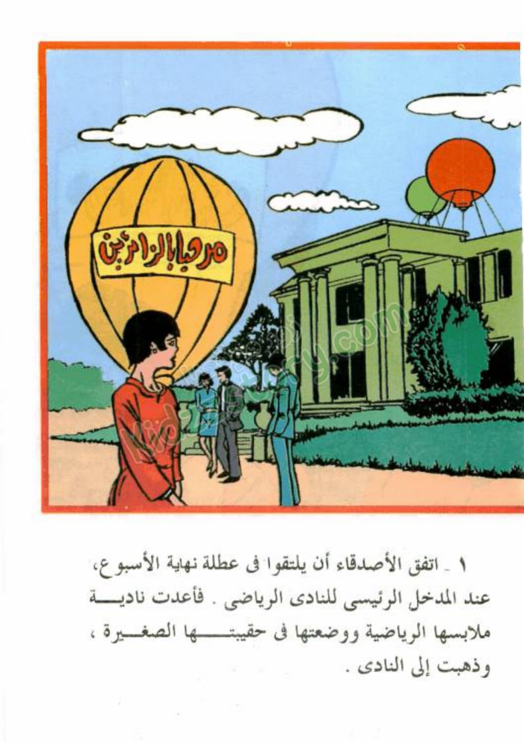 اتفق الأصدقاء أن يلتقوا في عطلة نهاية الأسبوع عند المدخل الرئيسي للنادي الرياضي. أعدت نادية ملابسها الرياضية ووضعتها في حقيبتها الصغيرة، وذهبت إلى النادي. وعند مدخل النادي تجمع الأصدقاء، حيث شاهدوا بالونا كبيرا مملوءا بالهواء، بألوانه المتناسقة الجميلة، كتبت عليه عبارات الترحيب بالزوار بمناسبة العيد السنوي لافتتاح النادي.