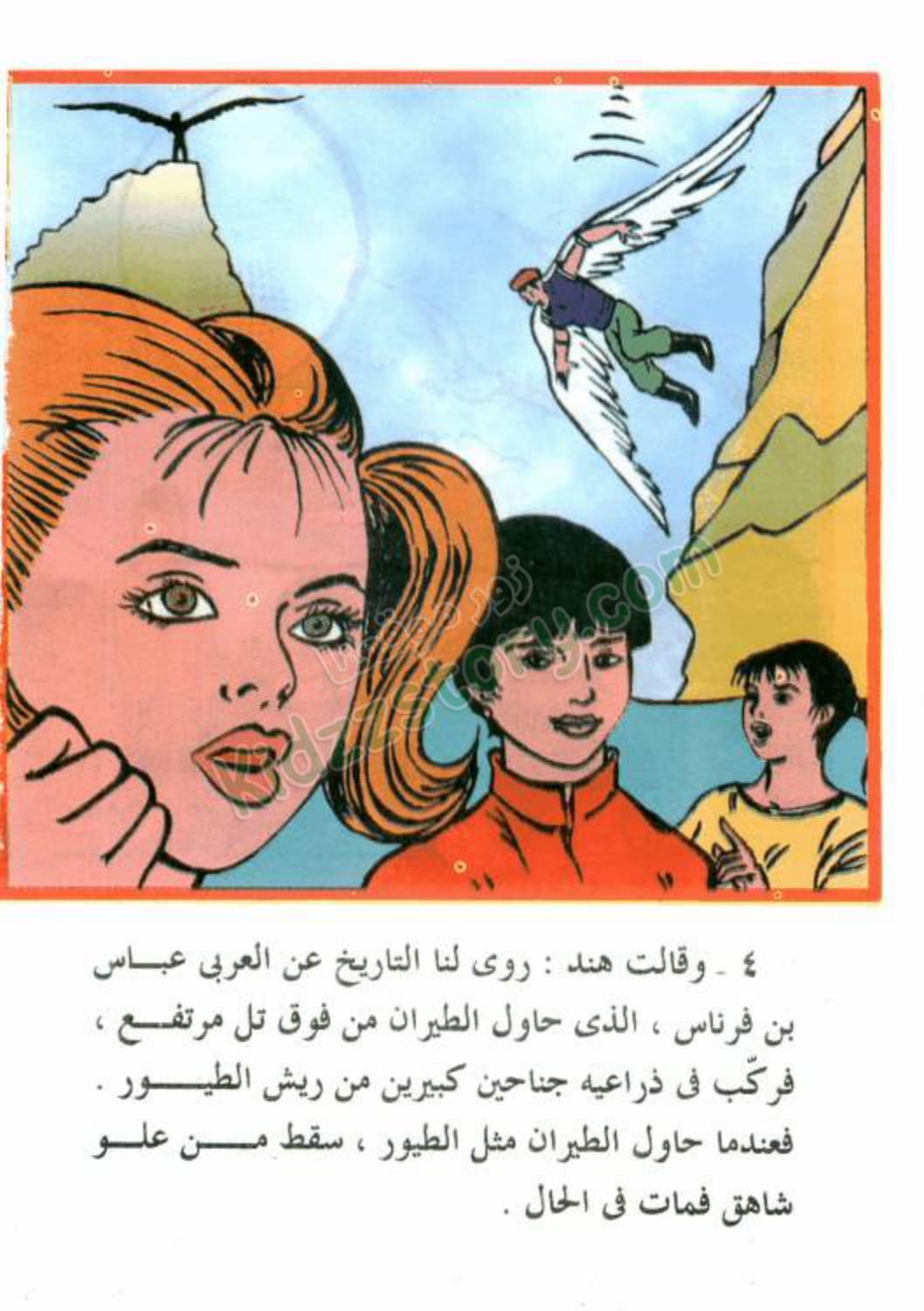 راح الأصدقاء في حديقة النادي يتحادثون فيما بينهم عن ذلك البالون الجميل. قالت نادية: “عندما حاول الإنسان الطيران مثل الطيور، كان المنطاد الخطوة الثانية في محاولاته.” وأضافت هند: “يروي لنا التاريخ عن العباسي عباس بن فرناس الذي حاول الطيران من فوق تل مرتفع، مستخدمًا جناحين كبيرين من ريش الطيور. وعندما حاول الطيران مثل الطيور، سقط من علو شاهق.”