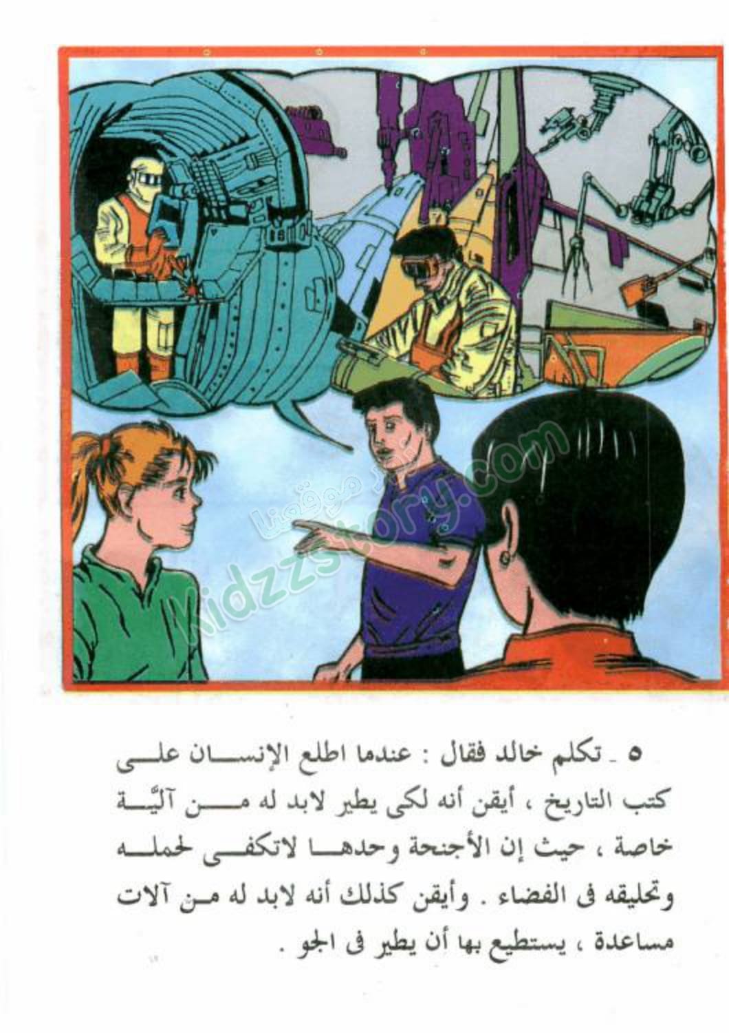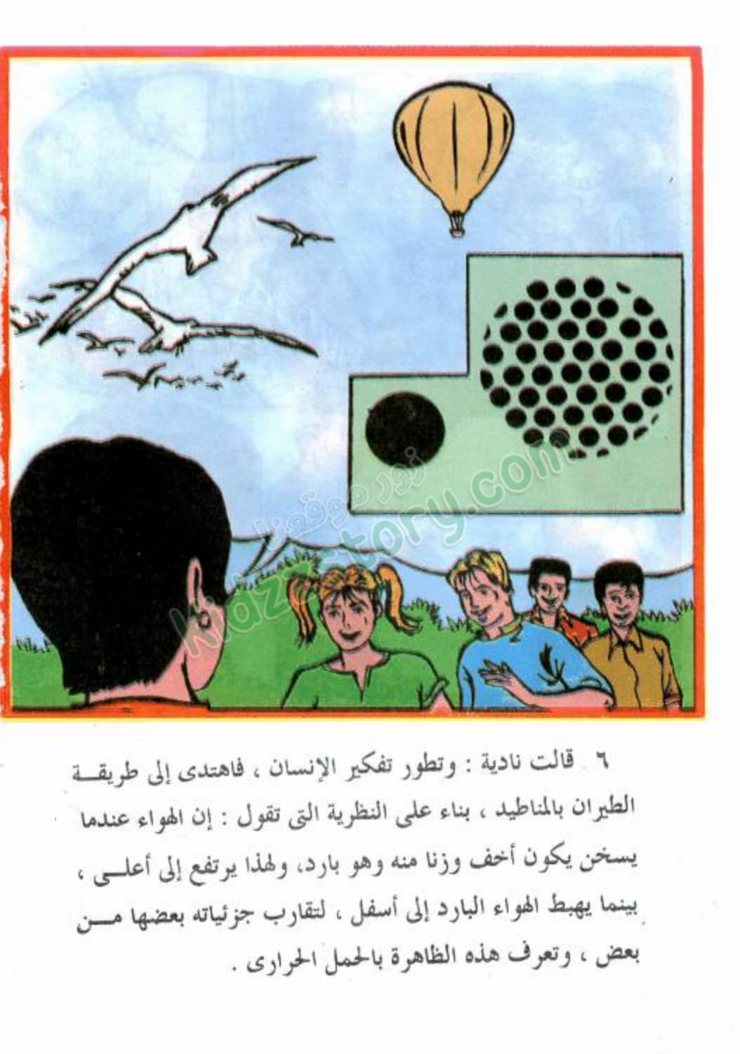 تكلم خالد قائلاً: “عندما اطلع الإنسان على كتب التاريخ، أيقن أنه لكي يطير يجب أن يكون له آلية خاصة. حيث إن الأجنحة وحدها لا تكفي لحمله وتحليقه في الفضاء. وأيقن كذلك أنه يحتاج لمساعدة ليتمكن من الطيران في الجو.” أكملت نادية: “تطور تفكير الإنسان واهتدى إلى طريقة الطيران بالمناطيد بناءً على النظرية التي تقول: إن الهواء عندما يسخن يكون أخف وزنًا منه وهو بارد، ولهذا يرتفع إلى أعلى، بينما يهبط الهواء البارد إلى أسفل.”