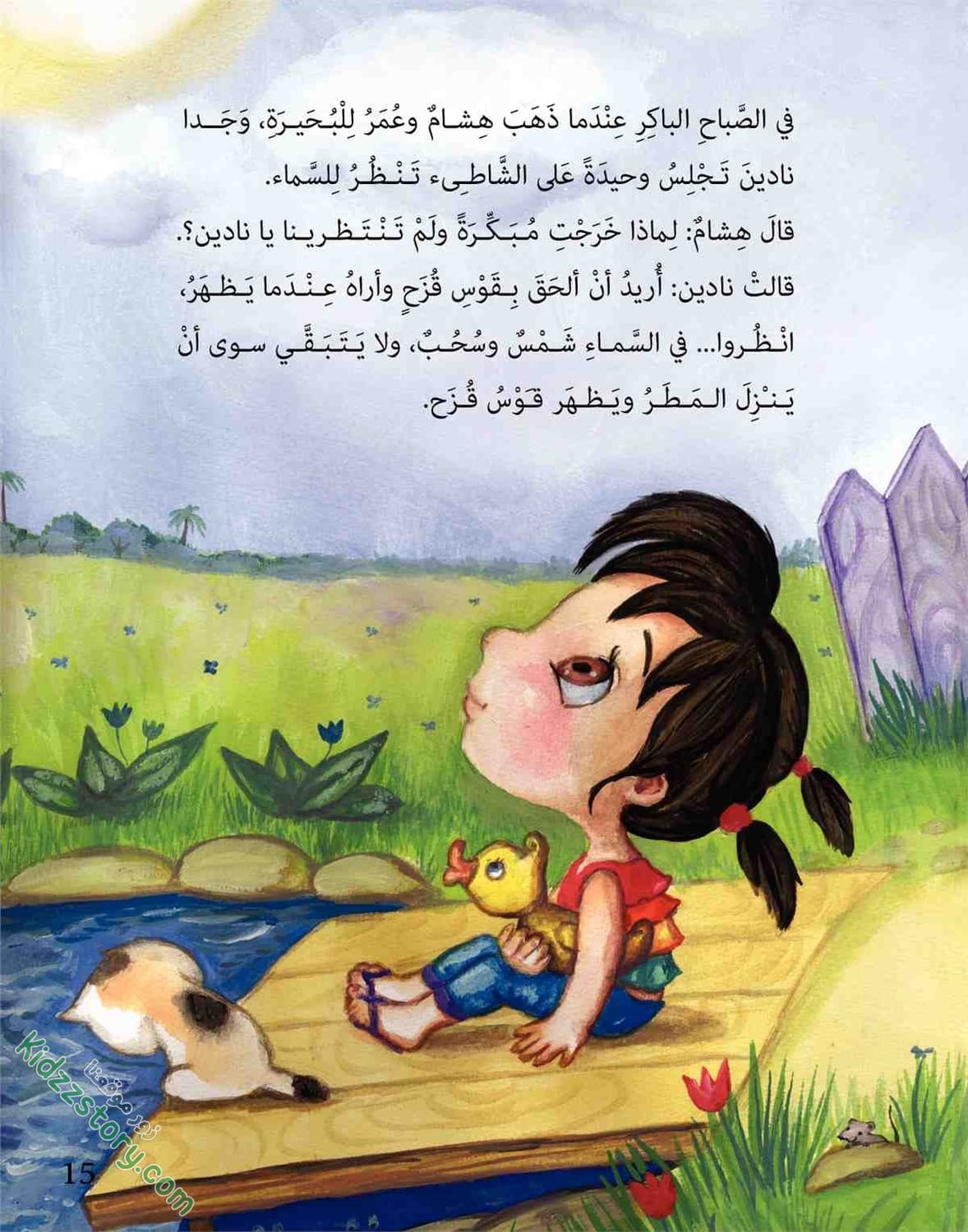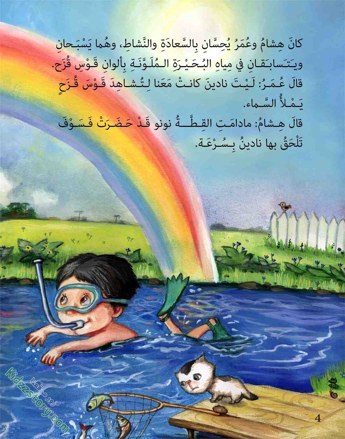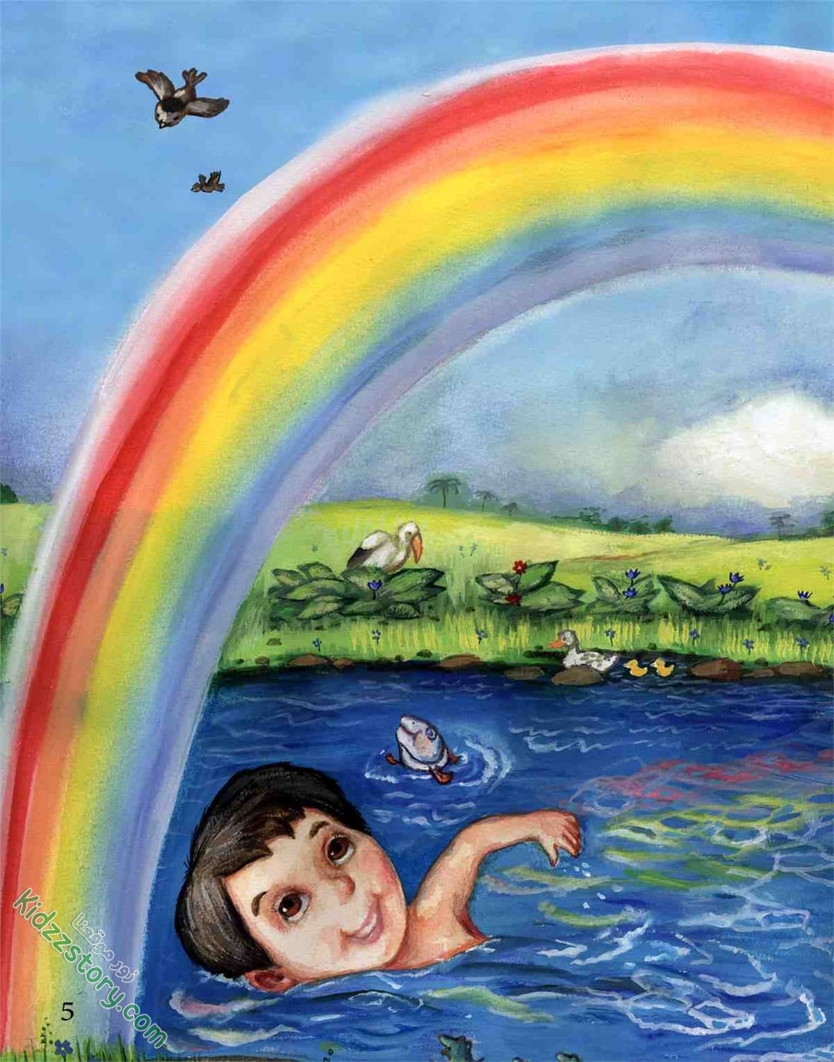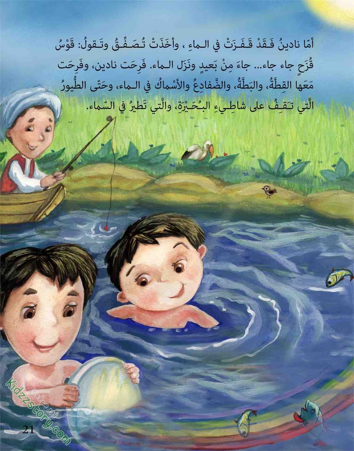أما نادين فقد قفزت في الماء، وأخذت تصفق وتقول: قوس قزح جاء جاء… جاء من بعيد ونزل الماء. فرحت نادين، وفرحت معها القطة، والبطة والضفادع والأسماك في الماء، وحتى الطيور التي تقف على شاطئ البحيرة، والتي تطير في السماء.