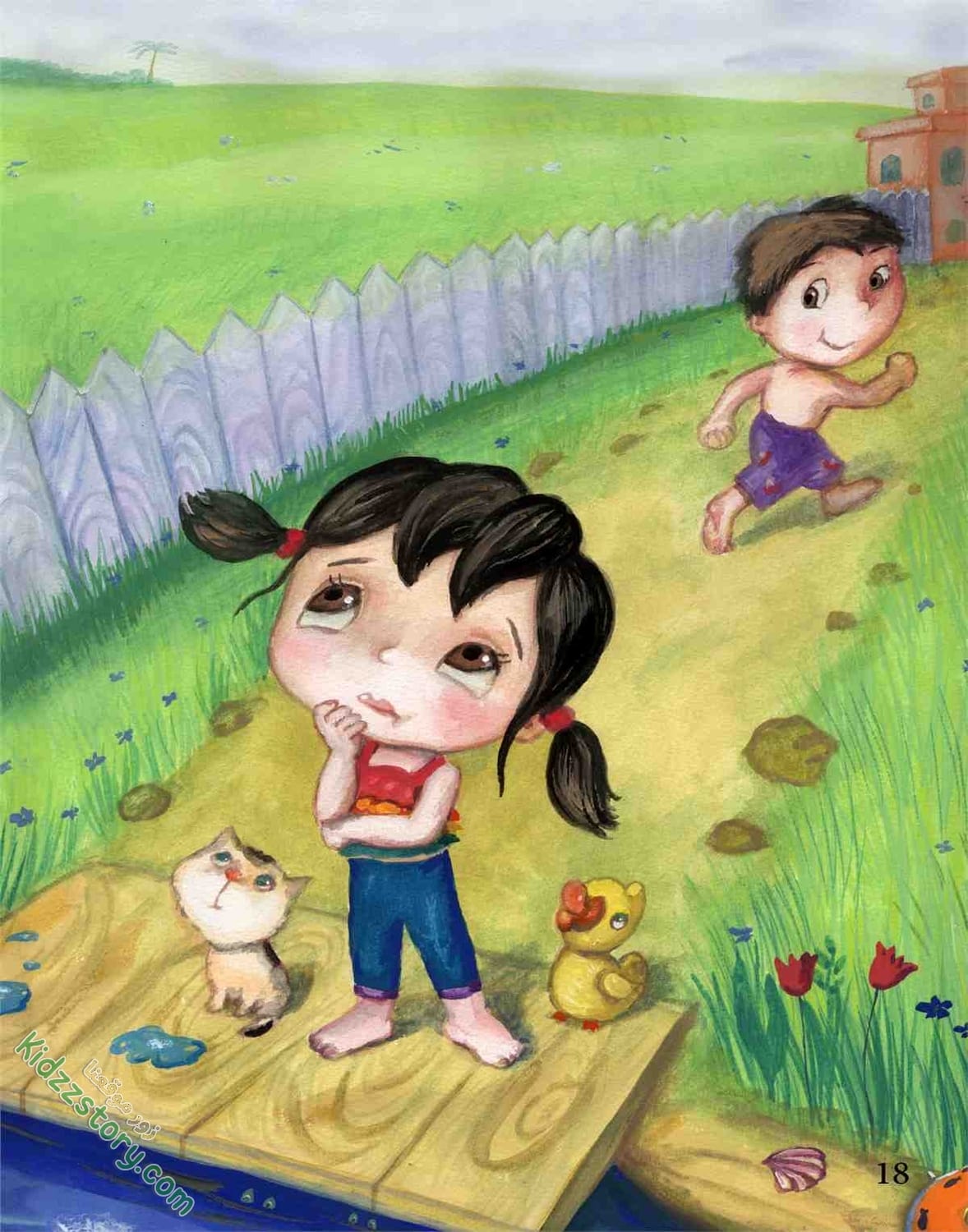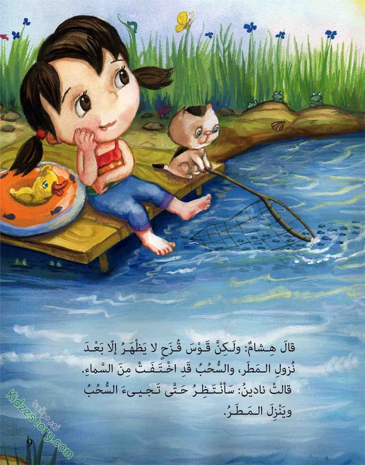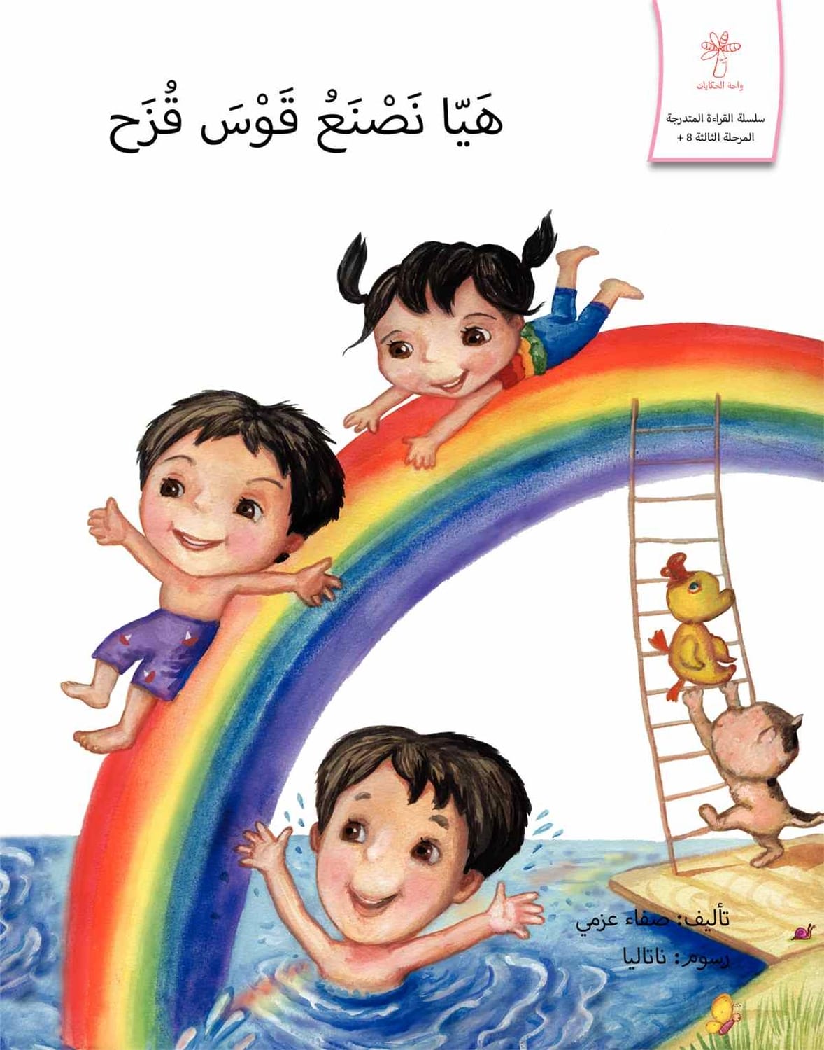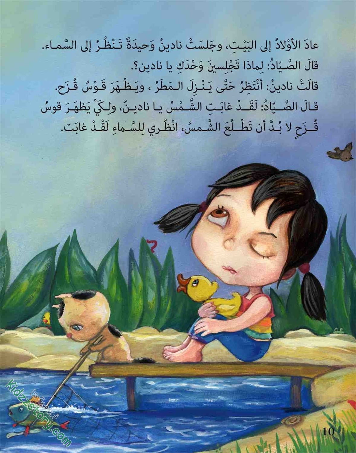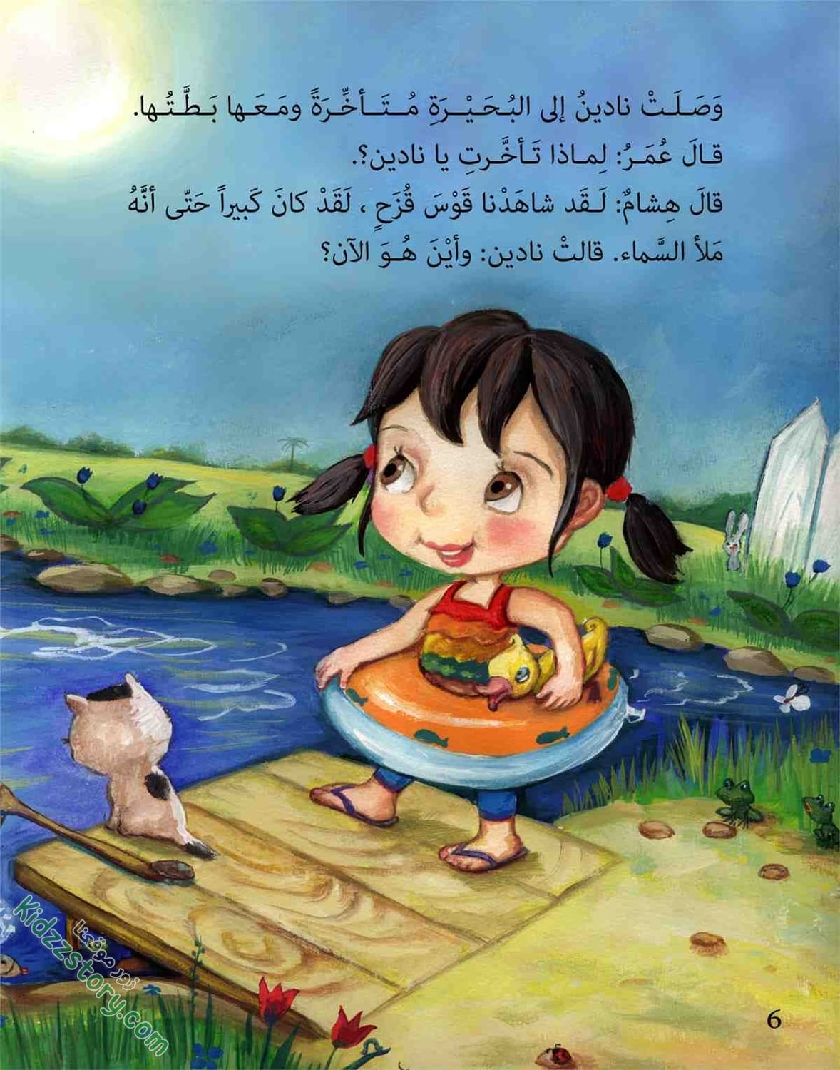 أما نادين فقد قفزت في الماء، وأخذت تصفق وتقول: قوس قزح جاء جاء… جاء من بعيد ونزل الماء. فرحت نادين، وفرحت معها القطة، والبطة والضفادع والأسماك في الماء، وحتى الطيور التي تقف على شاطئ البحيرة، والتي تطير في السماء.