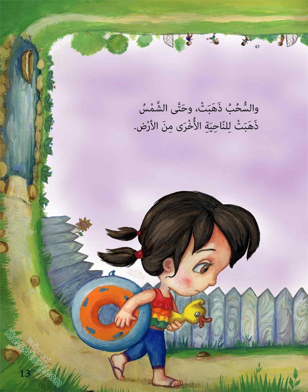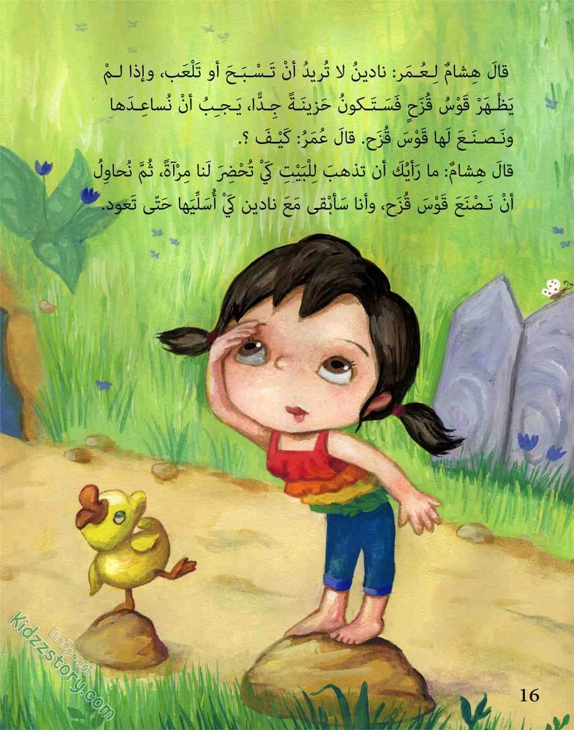 قال هشام لعمر: نادين لا تريد أن تسبح أو تلعب، وإذا لم يظهر قوس قزح فستكون حزينة جدا، يجب أن نساعدها ونصنع لها قوس قزح.