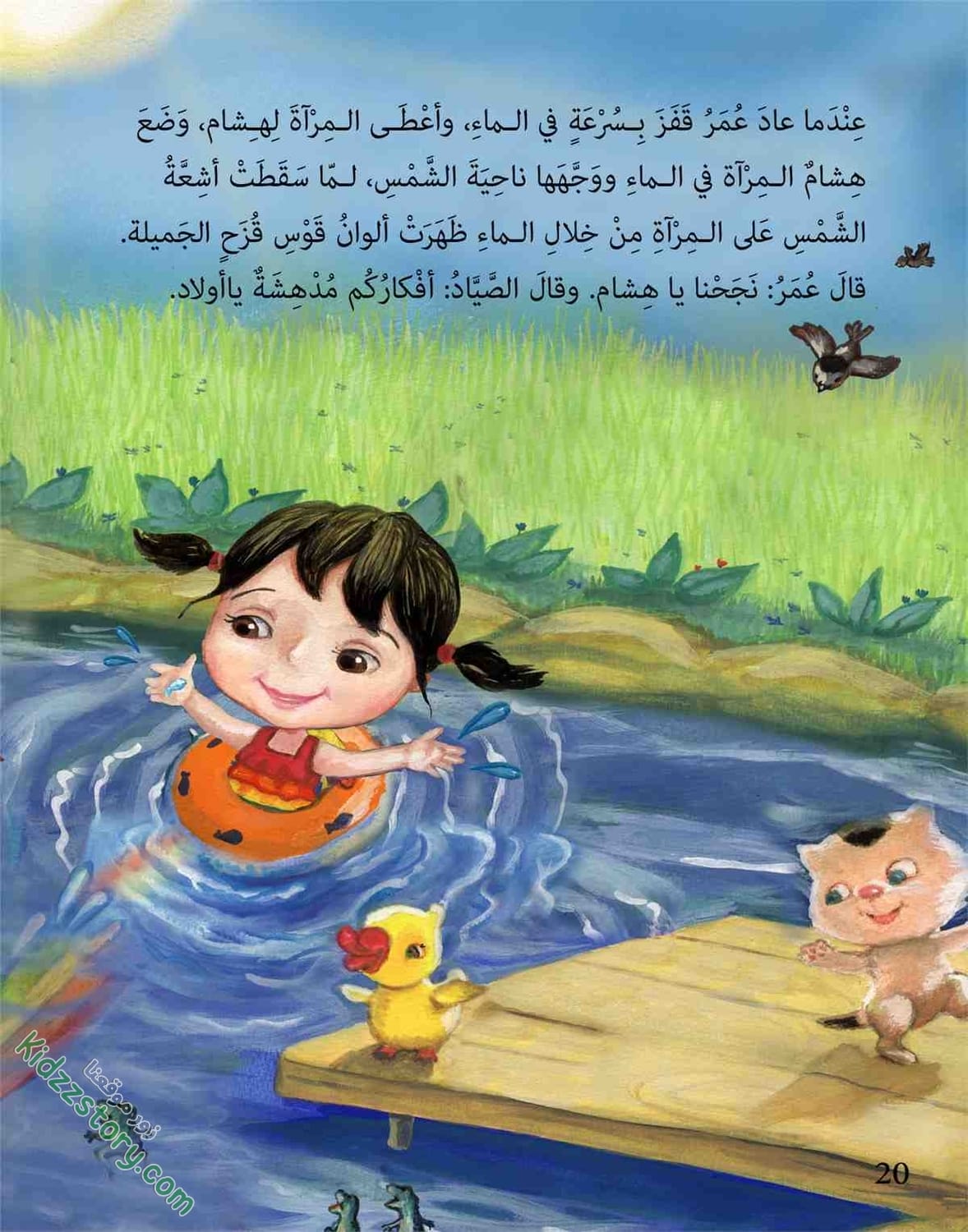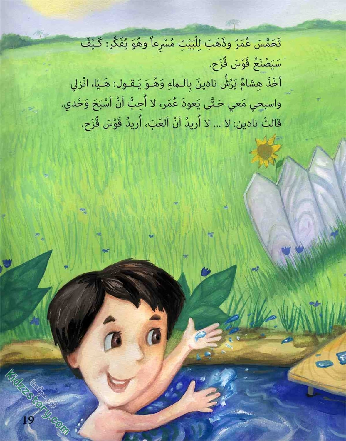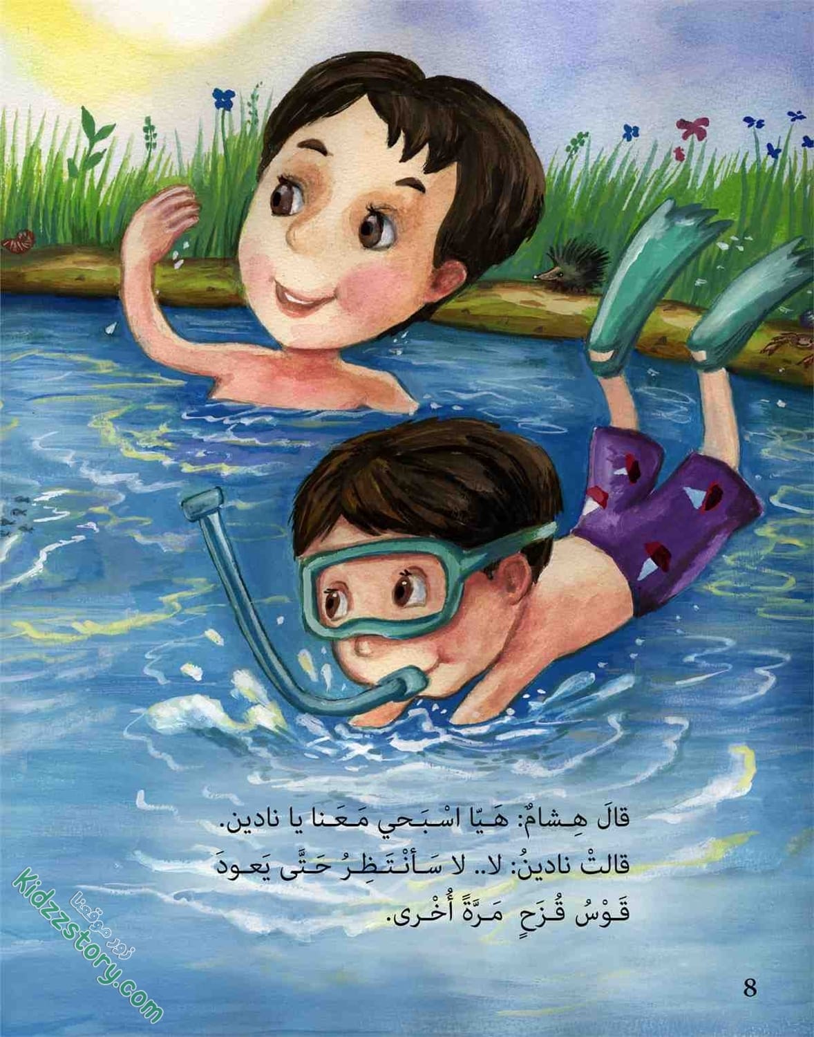 أخذ هشام يرش نادين بالماء وهو يقول: هيا، انزلي واسبحي معي حتى يعود عمر، لا أحب أن أسبح وحدي.
